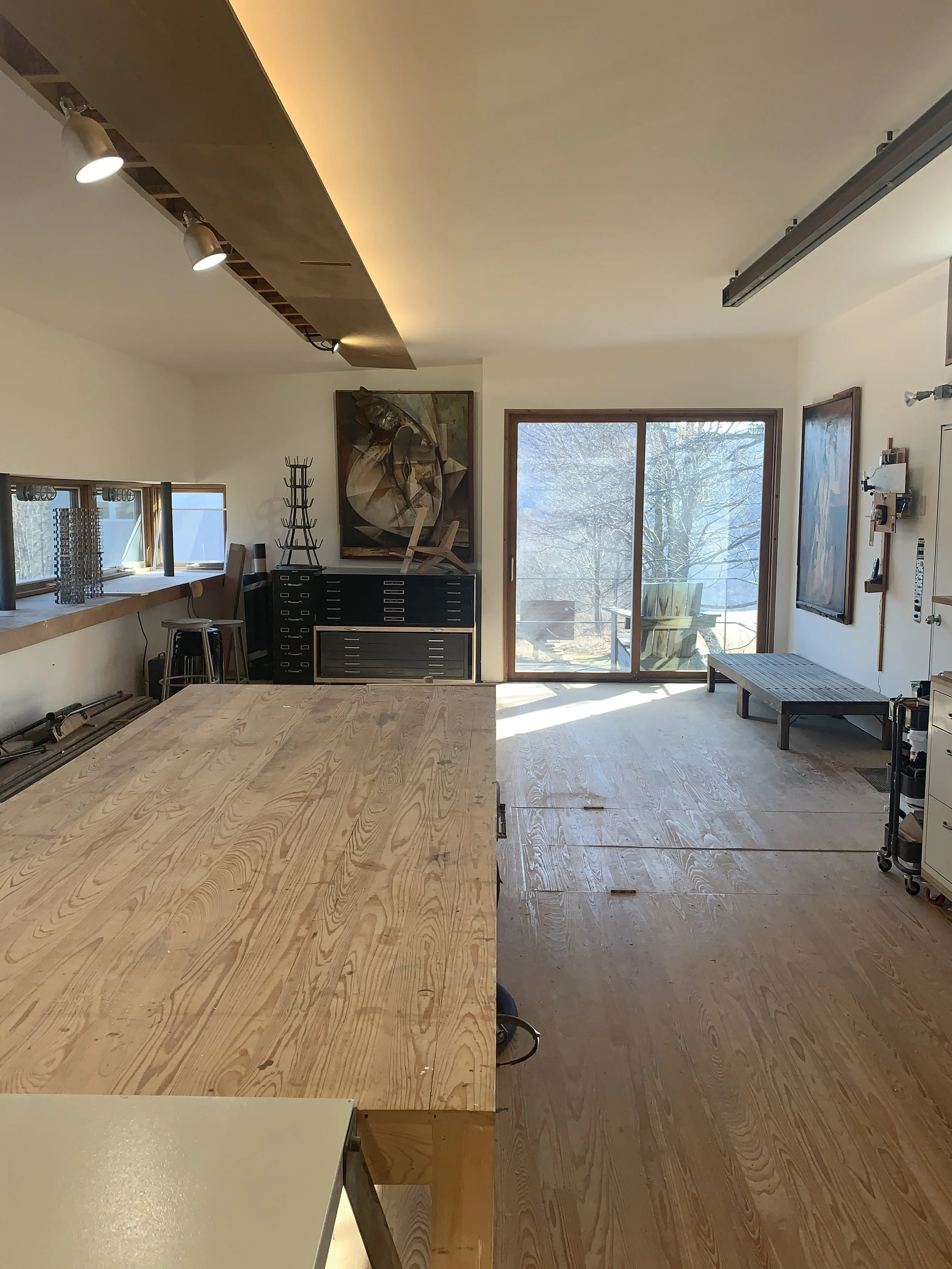 Located on a secluded and sloping site in the Catskill Mountains, the house is a reconstruction and redesign of an abandoned structure. The design incorporates the dramatic views of the valley and surrounding hills through strategically inserted windows and sliding glass doors to capture the panorama and the constantly changing natural light. An added two-story workshop doubles as a garage and makes a contemporary reference to the traditional barn structures of the area. This building complements the house to create a forecourt, connecting both structures and framing the landscape. A reduced palette of materials such as marine-grade plywood, standing seam metal siding, and locally sourced wood create a visual consistency and minimize maintenance. A wood-burning stove is the only source of heat while operable windows ensure passive cooling when needed. Custom-built cabinetry and furniture incorporate local materials such as natural rocks and found industrial objects to add character to the minimal interiors of the house and workshop.