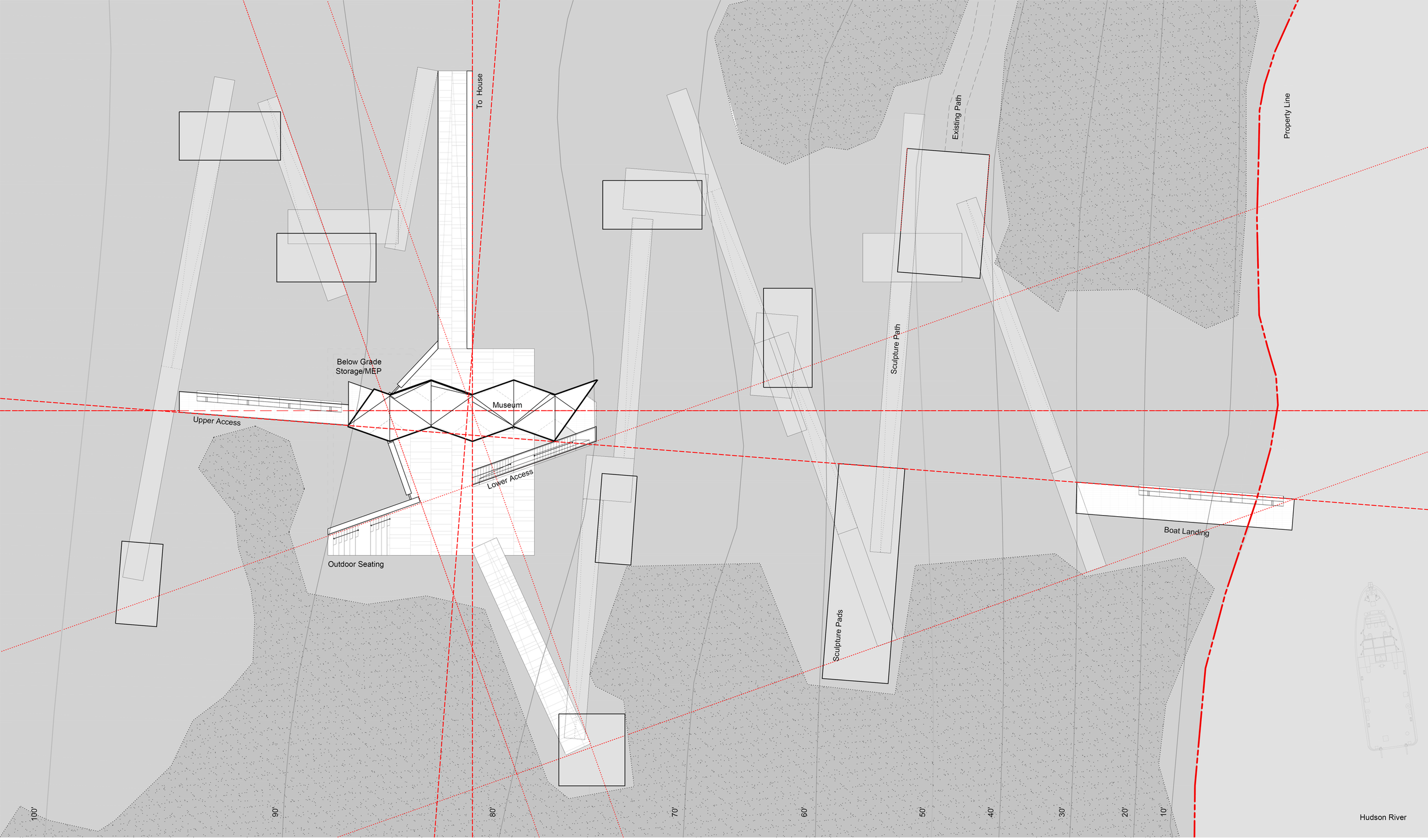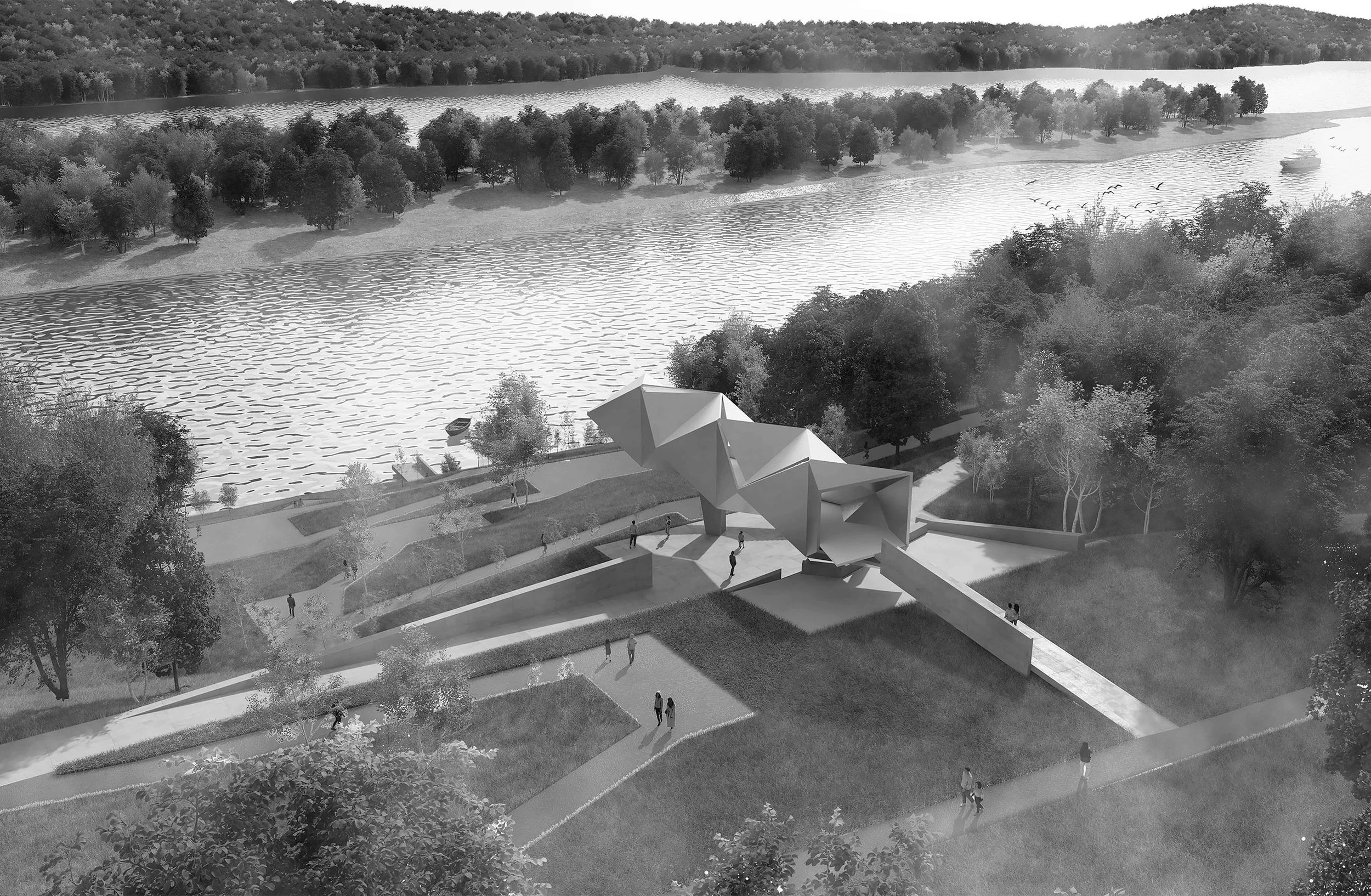 Located along the Hudson River the project is a tribute to the artistic legacy of the painter, sculptor, and teacher Milo Lazarevic. Rising up from the river is a series of landscaped paths and platforms presenting his sculptures along the promenade which terminates in a sculptural ‘object’ housing his paintings and ready-mades.